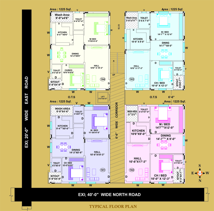 Walls: External -9 inches, Internal - 4 1/2 inches, with clay bricks